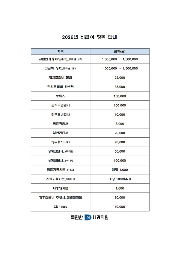 공지 비급여 항목 수가 안내 페이지 정보 작성자 특편한치과 댓글 0건 조회 1,934회 작성일 25-08-04 14:34 목록 본문 2026년 비급여 항목 수가 안내입니다. 이전글2025년 9월 진료 안내❤❤ 25.08.25 다음글★8월 휴진 안내★ 25.07.22 댓글 0 댓글목록 등록된 댓글이 없습니다.